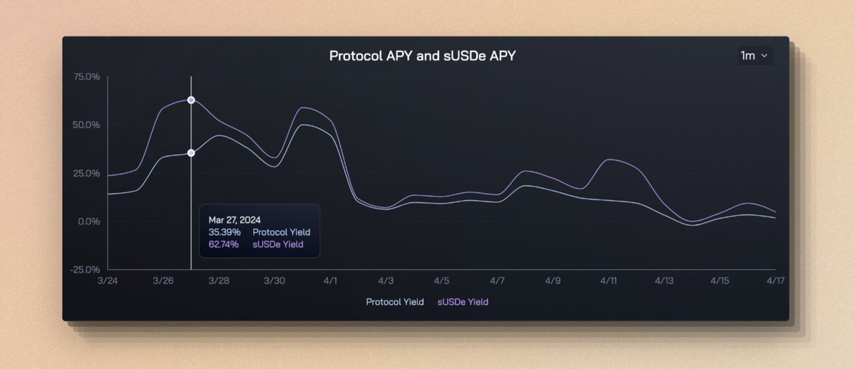 但是随着市场降温,交易所中的多头资金变少,则资金费率收入也会随之下降,所以在进入4月以后,综合收益都有一个明显的下降趋势,目前Protocol Yield降低至2%,sUSDe Yield降至4%。