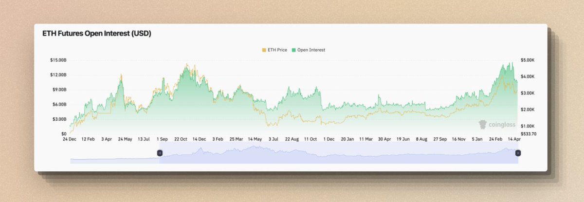 Open Interest指的是在交易所中未平仓合约的总数。在这里,它特指ETH在中心化交易所中的永续合约未平仓头寸的总价值。目前这个数字约为120亿美元(2024年4月)。这个数字反映了市场参与者对ETH的当前持仓水平。