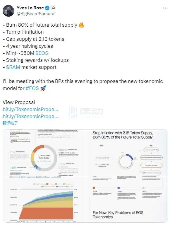 4 月 25 日,EOS 网络基金会(ENF)首席执行官 Yves La Rose 在 X 平台提出新代币经济学,要点包括: -将销毁未来总供应量的 80%; -关闭通胀; -将供应上限设定为 21 亿枚代币; -4 年减半周期; -铸造约 9.5 亿枚 EOS; -与锁定相关的质押奖励; -支持 RAM 市场。