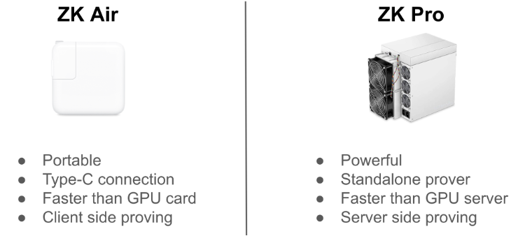 ZK Air 将会是面向普通用户的产品,这是一款轻量级便携式 ZK DePIN 设备,体积接近笔记本电脑电源,提供大于顶级消费级显卡所能提供的算力,ZK Air 算力可媲美 10 张 RTX 4090。用户可将 ZK Air 接入电脑或移动设备,为 ZK Proof 提供加速服务。