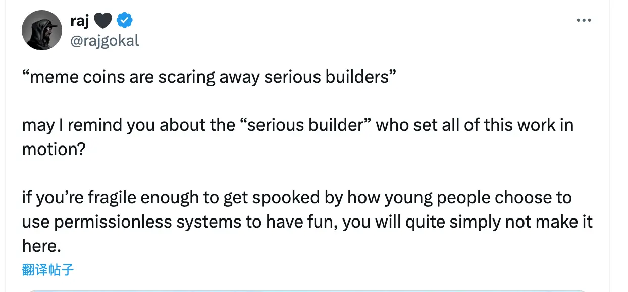 Solana 联创 raj 站出来维护 meme 币,对于「meme 币让真正的建设者大量流失」的论调讽刺道,如果这些所谓的真正建设者,脆弱的连 meme 币都害怕,那他根本无法成功。