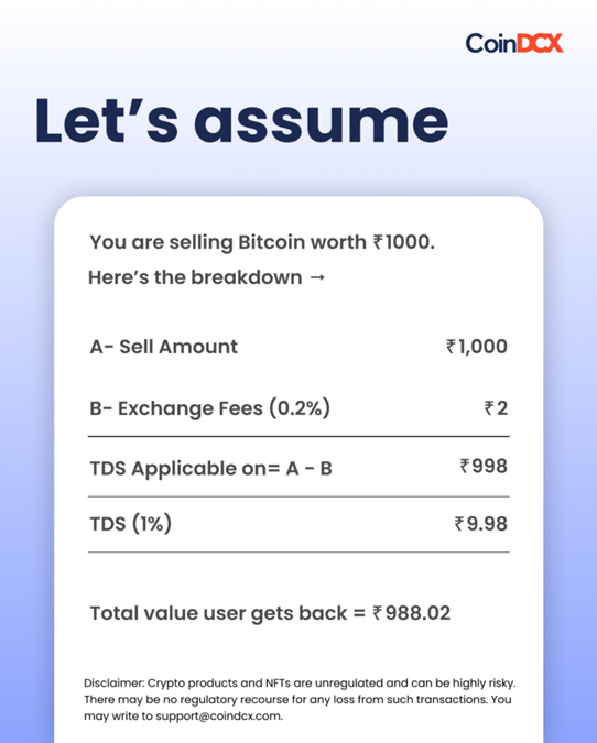 TDS 对投资者来说是特别沉重的负担,因为它在货币实现时征收 1% 的税。例如,如果你出售价值 1000 卢比的比特币,将被征收 9.8 卢比的税,即 998 卢比的 1%,不包括交易费(2 卢比,假设为 0.2%)。