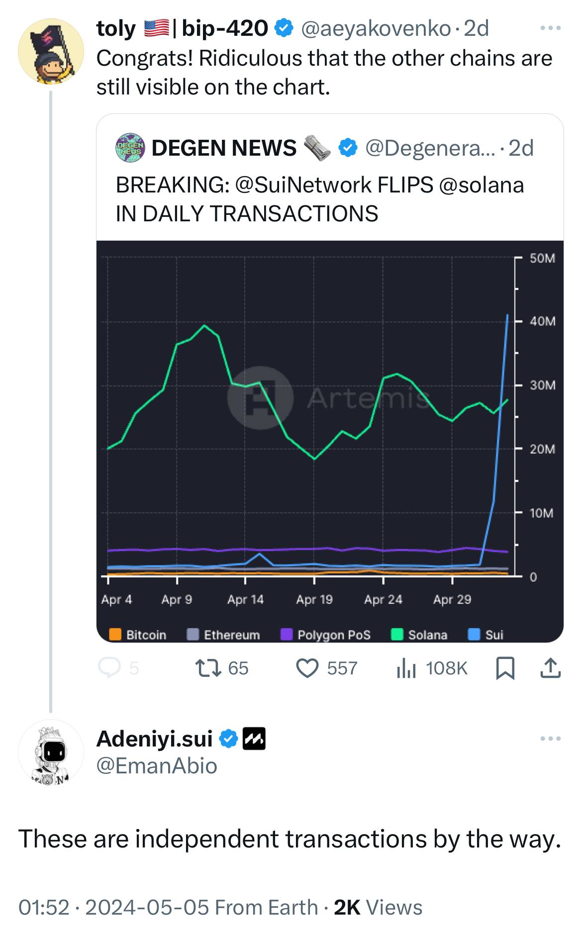 Solana 的联创 Toly 大方转发了这条消息并送上祝贺,而 Sui 的联创兼 CPO Adeniyi 也下场澄清「这些全都是独立的交易」,强调数据的真实性。