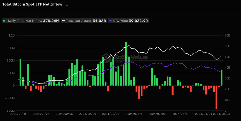 SoSoValue 数据:美国东部时间 5 月 3 日,BTC 现货 ETF 总净流入 3.78 亿美元,为过去 7 日净流出后首次净流入,其中,富达(Fidelity) FBTC,单日净流入最高,为 1.03 亿美元,目前 FBTC 历史总净流入达 80.30 亿美元。