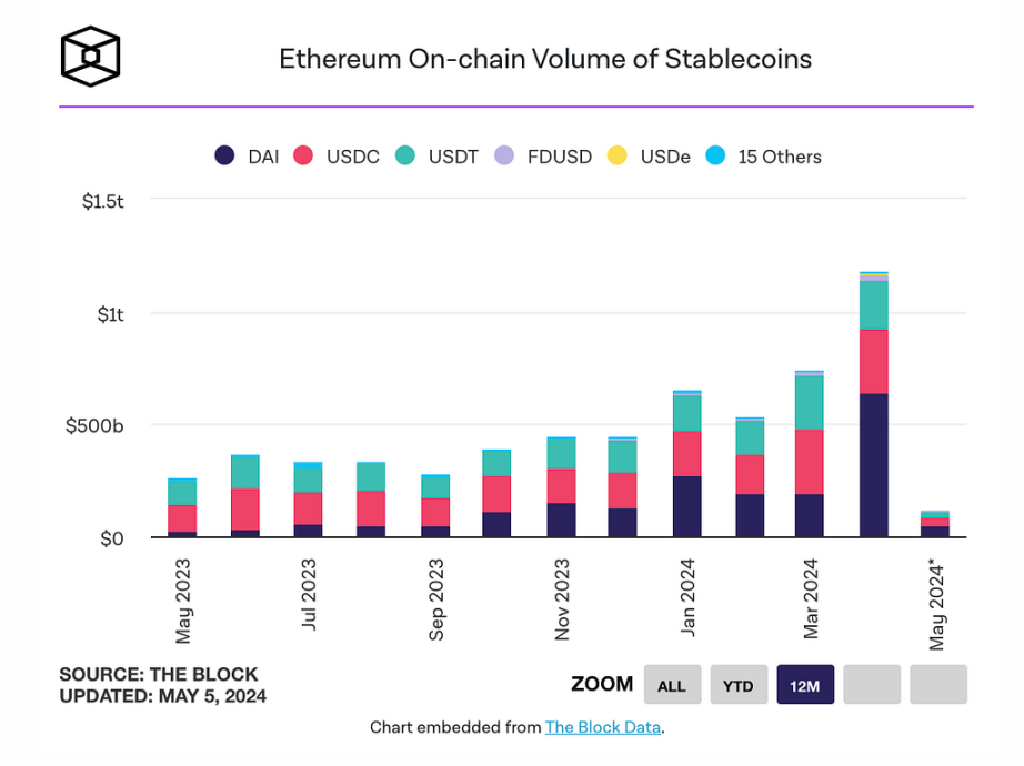 据 The Block 报道:过去 3 个月,ETH 上稳定币的月交易量持续增长,并在 4 月份创月度交易量新高。其中,FDUSD 更是创下最佳月度记录。