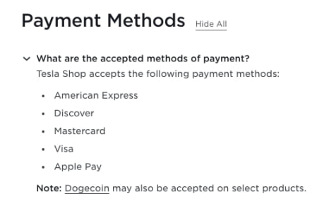 据 Wayback Machine 回溯,该特斯拉官网「付款、结账和定价」页面最近一次快照发生在今年 2 月 28 日,而 Dogecoin 常见问题解答页面在 2022 年 1 月便已经存在。