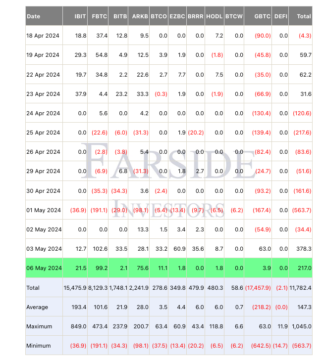 包括英国投资公司Farside在内的数据来源证实,包括灰度比特币信托基金(GBTC)在内的所有10只现货ETF都出现了中性正流入。这些资金共计 2.17 亿美元。