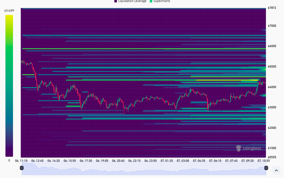监控资源 CoinGlass 的数据证实,每日收盘后,在 63,500 美元附近的买入流动性被清空,比特币随后反转,在高出 1,000 美元附近攻击更大的流动性云团。