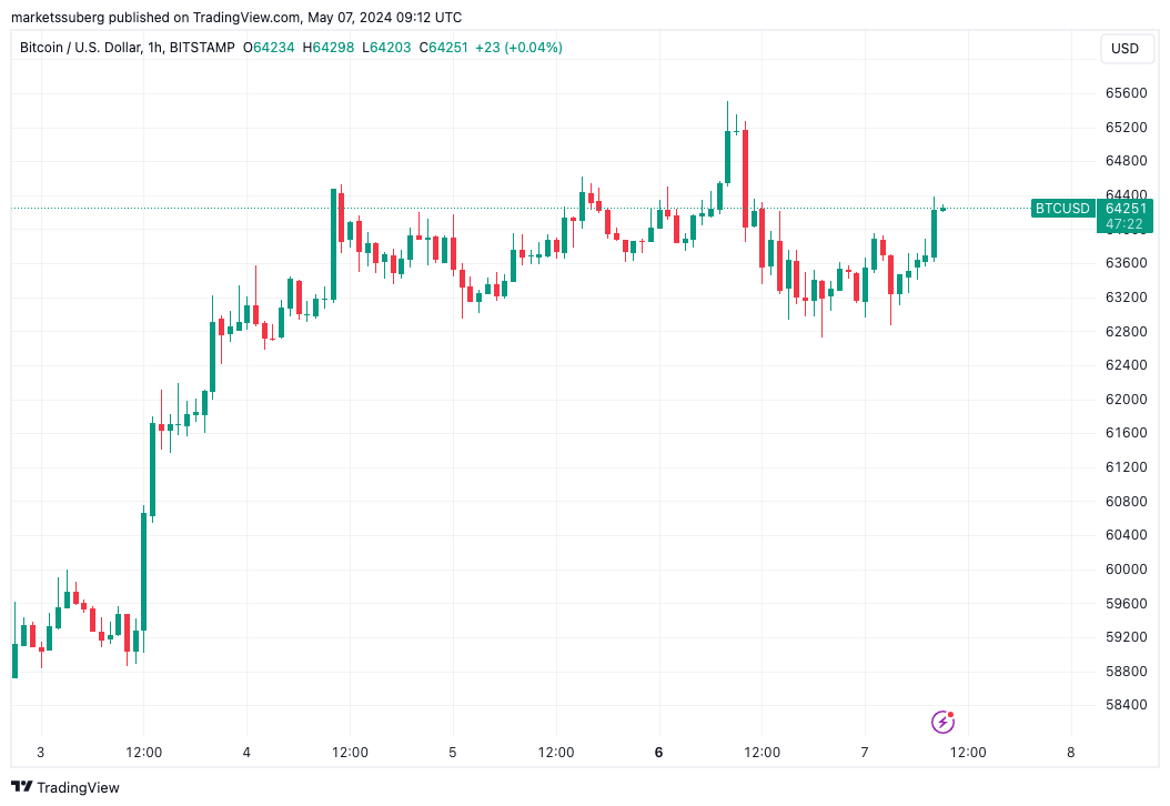 来自 Cointelegraph Markets Pro 和 TradingView 的数据显示,BTC 价格走势从 Bitstamp 当日低点 62864 美元开始走高。