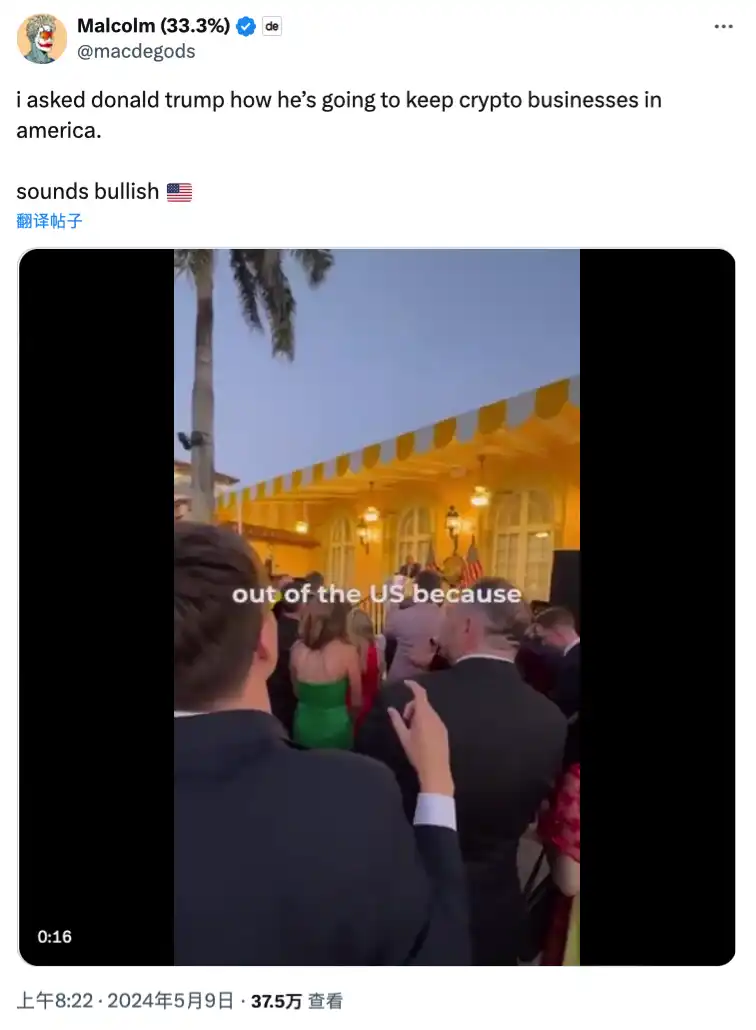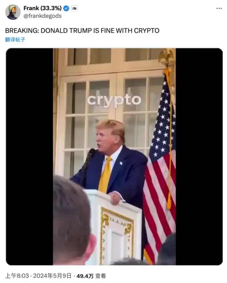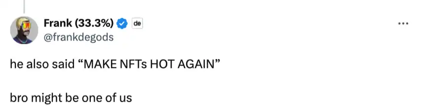 DeGods 创始人 Frank 作为美国 NFT 社区知名创始人及 KOL 也参与了这场晚宴,在上述视频外 Frank 还在自己的 X 帐号上发布了另一条活动现场视频,视频中特朗普表示「要让 NFT 再次火热起来」。