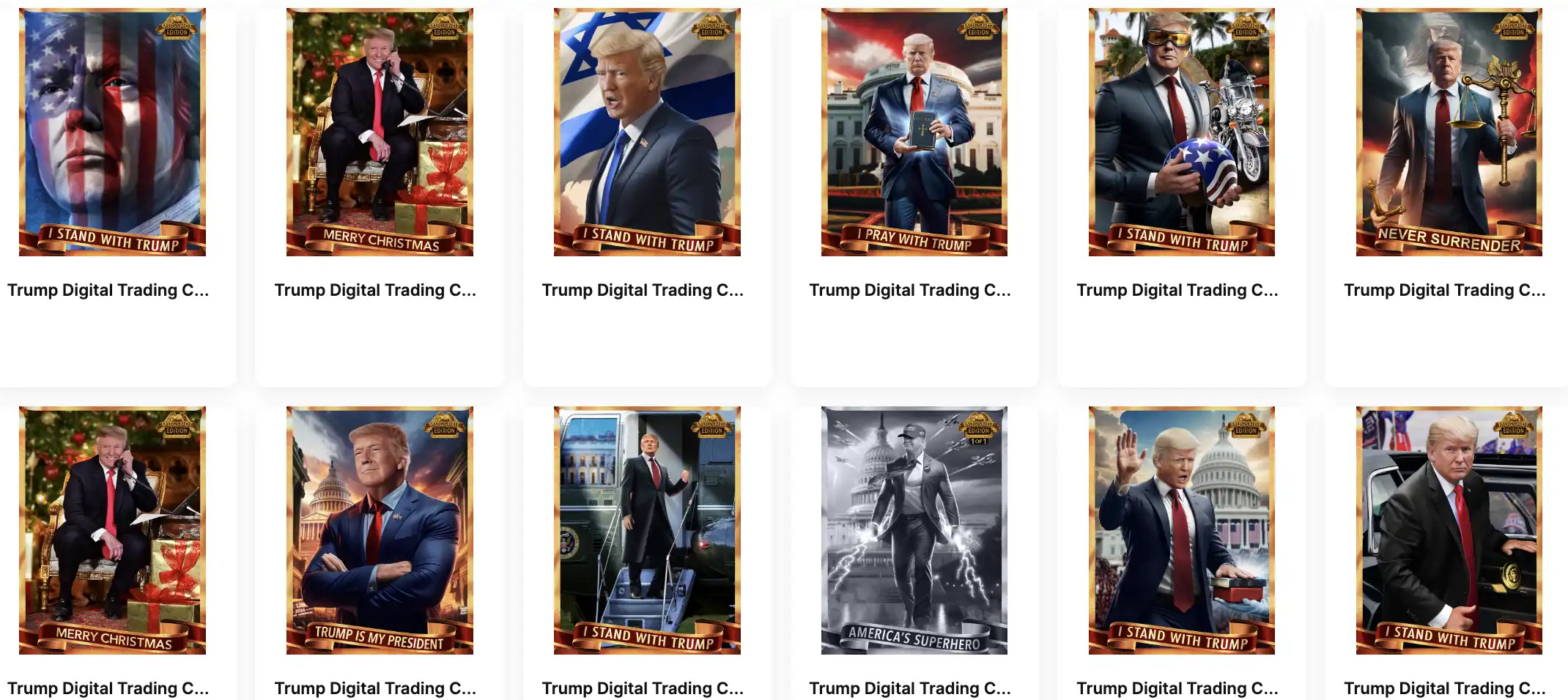 昨日,特朗普在法院出庭后飞回佛罗里达州,与他的「Mugshot Edition」NFT 交易卡的主要买家举办了一场私人晚宴。Mugshot Edition NFT 系列也大有来头,其内容是他去年在佐治亚州因密谋推翻该州 2020 年选举结果而被逮捕时的照片及各种衍生插图,包括逮捕现场照片、特朗普戴着牛仔帽的插图,还有手握闪电、下面写着「美国超级英雄」的卡通特朗普形象。