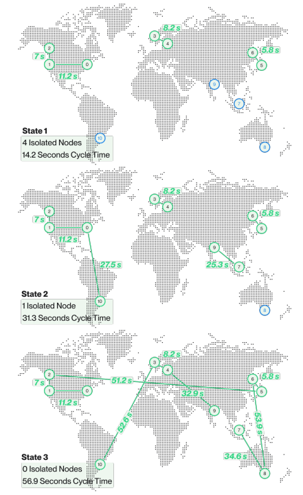 人工智能路由为AIOZ DePIN 节点分配任务的传输路径,绿色表示有链接的节点,而蓝色表示由于低置信度而跳过链接的部分。