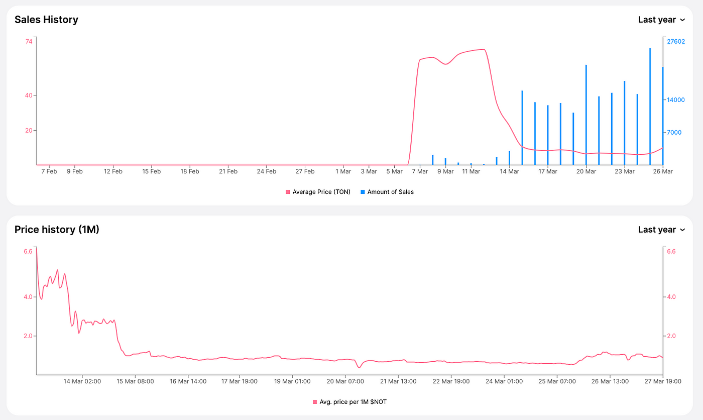 自 3.15 开始,Notcoin NFT 的交易量开始活跃,25 日近期最高交易 2.5 万张,成交均价为 10M=6.7TON,成交额为 83.75 万美元,26 日交易 2.1 万张,成交均价为 10M=9.9TON,成交额为 103.95 万美元。成交最高价出现在 3.13 日 10M=66TON,最低价出现在 3.20 日 10M=3.7TON。