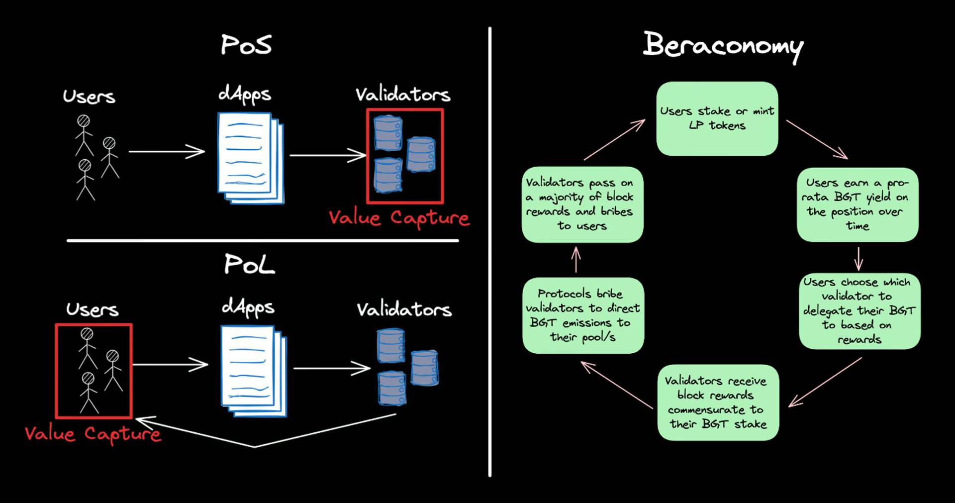 PoL是一种新颖的奖励机制,用于对齐用户、dApps和验证者。简而言之,用户持有/铸币 LP 代币并赚取 BGT,这些 BGT 可委托给验证者,验证者可获得与其 BGT 股份相称的区块奖励。因此,安全性直接与流动性挂钩。更具体地,请参考: