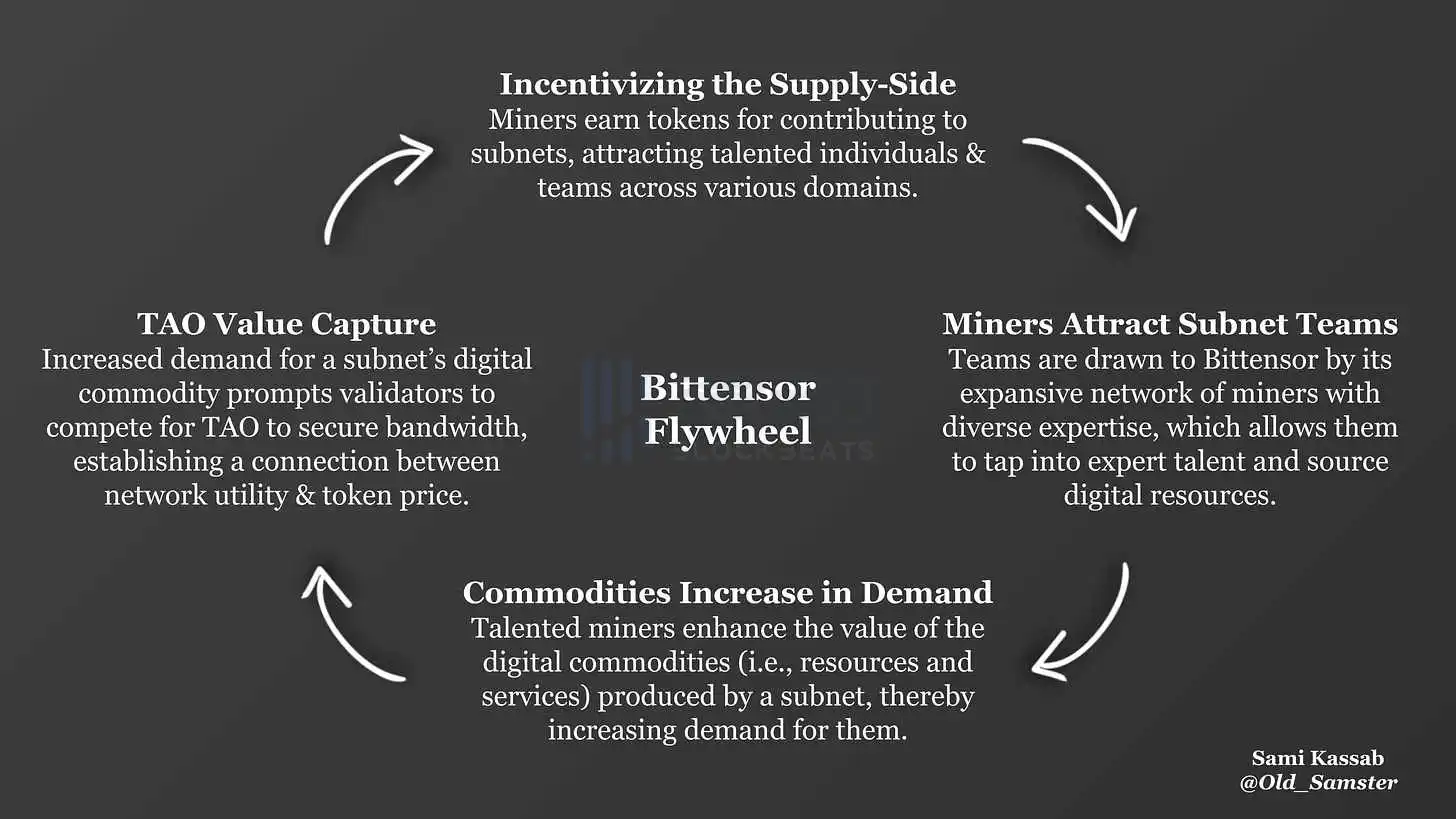 随着越来越多的优秀矿工加入 Bittensor 的挖矿网络,越来越多的团队被吸引启动子网,以获取解决其特定问题所需的专业人才,并获得他们正在寻找的数字资源。这产生了一种正循环效应,即优秀的矿工竞争奖励吸引了更高质量的子网团队,这些团队生产出更有价值的数字商品,最终增加了需求,促使验证者竞争 TAO 来确保其获得抵押并获得相应的资源分配。