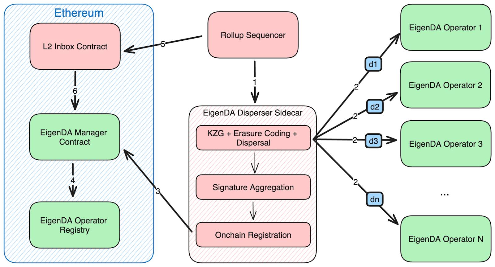 EigenDA 是一种安全、高吞吐量和去中心化的 DA 服务,其设计灵感来自 Danksharding。Rollup 能够将数据发布到 EigenDA,以便在整个 EigenLayer 生态系统中获得更低的交易成本、更高的交易吞吐量和安全的可组合性。