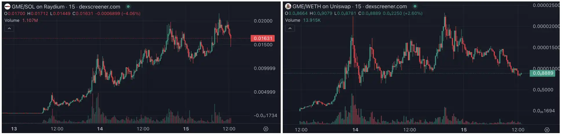 Solana 上的 GME,在推文当日开启暴涨,走出 20 倍涨幅之后接近腰斩,又在次日被热情的散户持续推动上涨,单日续涨 193%,两天涨幅超 40 倍。