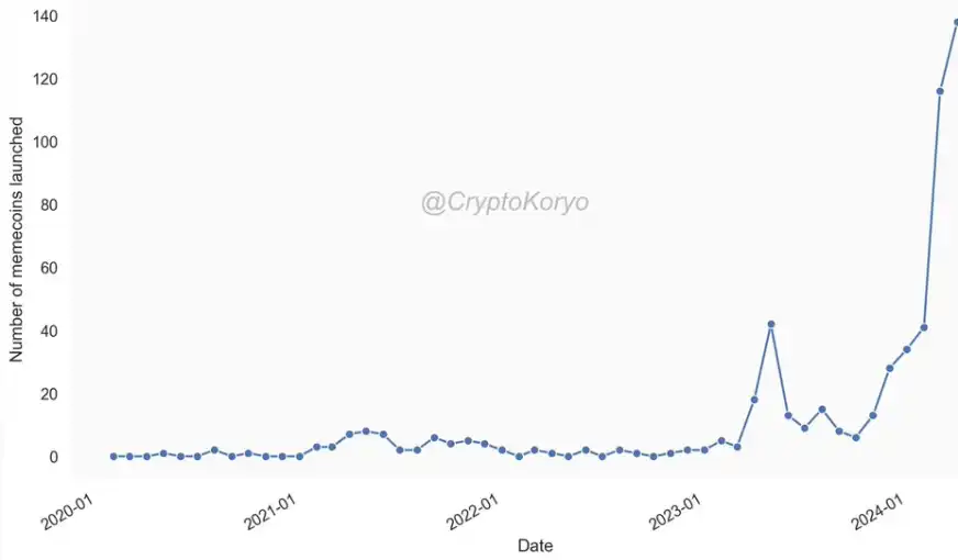 VC 加持的加密市场也终于成了「传统市场」,不再相信资本的散户将目标转向更具吸引力的 meme,数百倍涨幅的 meme 代币不断成为社区关注的焦点。推特用户 Crypto Koryo 统计了一些 meme 新代币数据,CoinMarketCap 在 2024 年 4 月列出了创纪录的 138 个 erc-20 memecoin,比 2023 年 4 月的 18 个增长了 666%。
