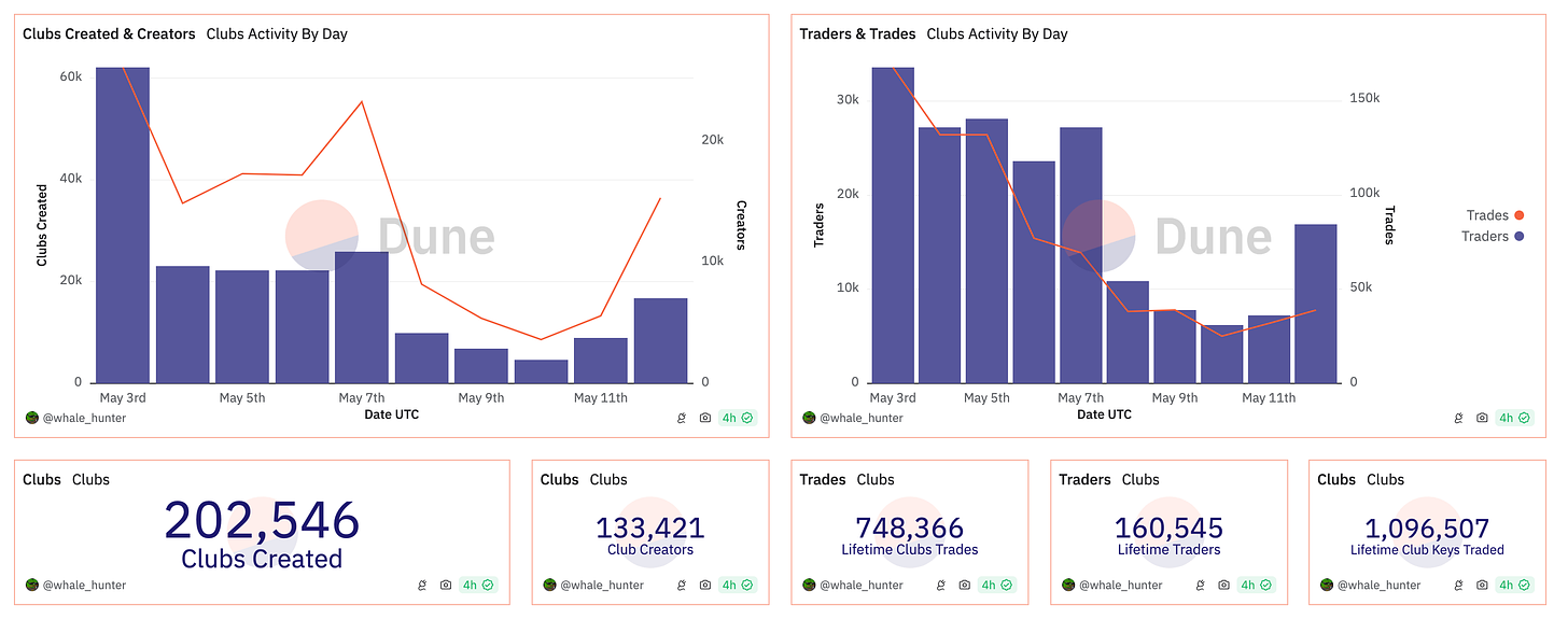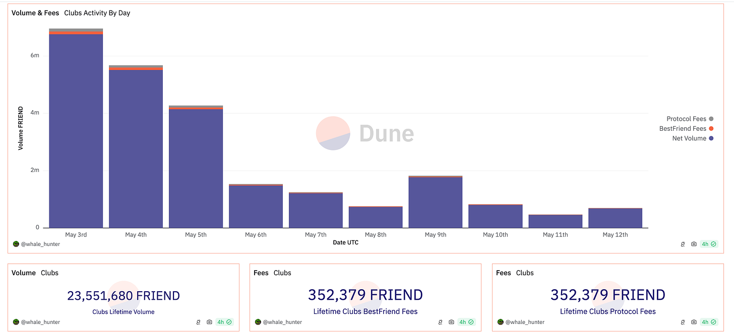 截止撰稿(5 月 13 日),Dune 仪表盘数据显示,Friend.tech 内已创建了 20.2 万个 Club,而 Club 的交易人数达到 16 万人,交易量达到 2355 万 FRIEND(市价合为 5110 万美元)。但值得注意的是, claim $FRIEND 空投,最开始用户只能认领其份额的 10%,剩下的 90% 则需要加入至少一个 Club 才可以 claim。所以 Club 的交易活动激增,也离不开这一 claim 规则。