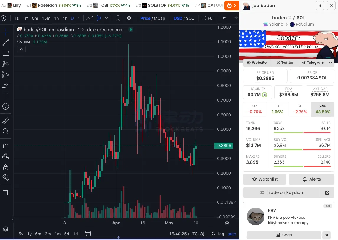 截至撰稿时间,据 dexscreener 数据显示,$Boden 的市值为$268.8M。作为美国总统大选的两大候选人之一,$Boden 在选举期间势必会迎来炒作的热潮。