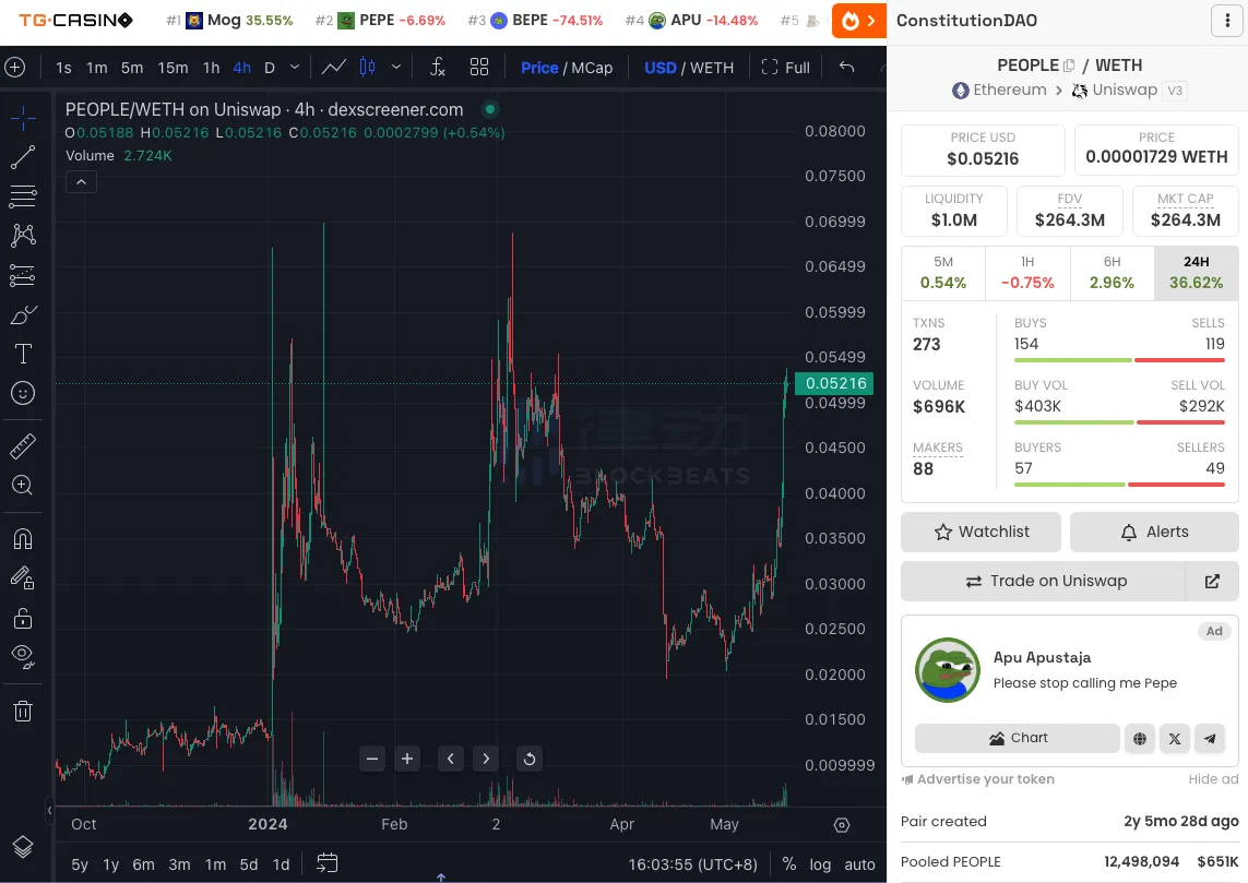 截至撰稿时间,据 dexscreener 数据显示,$PEOPLE 价格为$0.05216,市值为$264.3M。