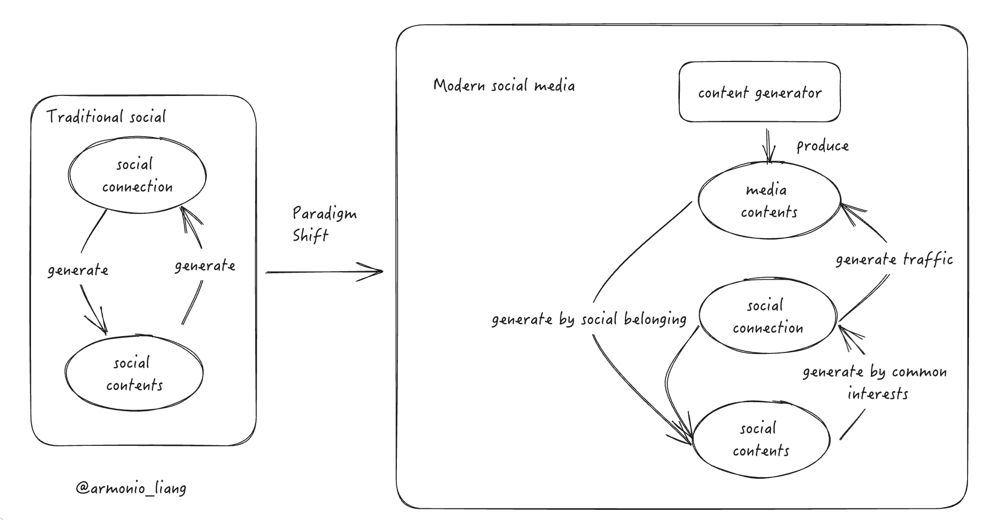 普通人爱用的社交工具已经由针对个人的注意力方案所取代。当前任何一个新一代的社交媒体都是针对个人进行内容推送,根据个人每时每刻对内容的好恶调整推荐内容。如果我们推崇 1V1 的内容推送,那么链上信息应该更多作为内容和用户的标签原始数据。