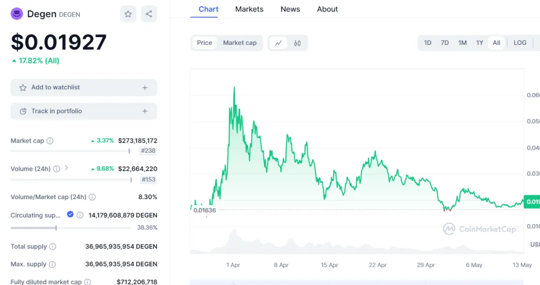 Farcaster本身的资产属性较弱,在此处选取社区发酵出的资产degen作为代表资产,在四月份随着base生态的火爆而价格飙升,最近随着生态的熄火而下跌