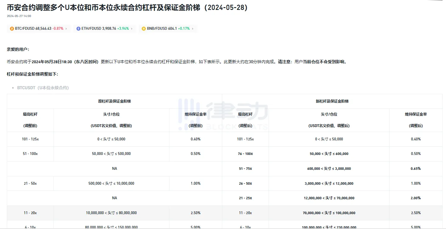 据官方公告,Binance 合约将于 2024 年 05 月 28 日 18:30(东八区时间)更新 BTCUSDT(U 本位永续合约)、ETHUSDT(U 本位永续合约)、BTCUSD(币本位永续合约)、ETHUSD(币本位永续合约)杠杆和保证金阶梯。