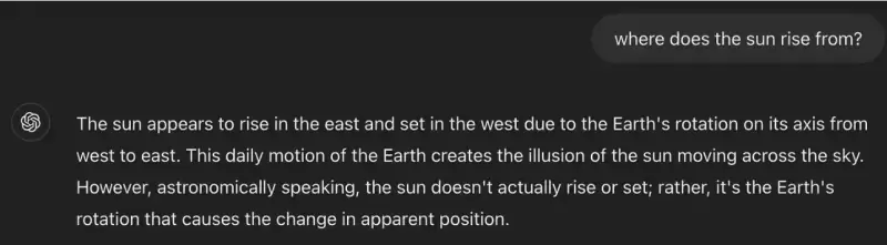 答案是从大量高质量训练数据中学习统计模式。如果考虑到互联网上的所有文本,什么更有可能出现--"太阳从东方升起 "还是 "太阳从西方升起"?后者可能出现在特定的语境中,比如文学隐喻("这就像相信太阳从西边升起一样荒谬")或关于其他星球的讨论(比如金星,太阳确实从西边升起)。但总的来说,前者更为常见。
