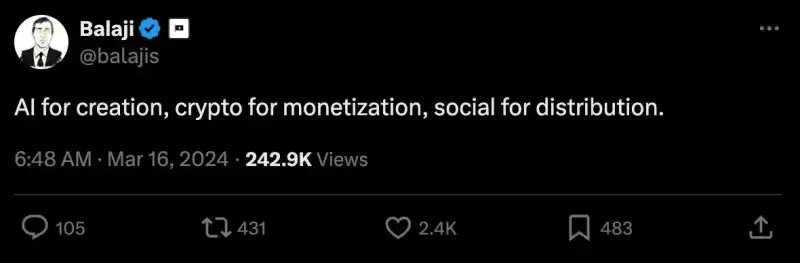 我们正处于 LLM 革命的早期阶段。就像 2016 年的以太坊一样,我们几乎不知道可以用它们构建什么样的应用程序。是能与我奶奶用印地语交流的 LLM?能在各种信息流中找到高质量数据的代理?一种机制让独立贡献者分享特定文化的细微差别(如俚语)?我们还不太知道什么是可能的。