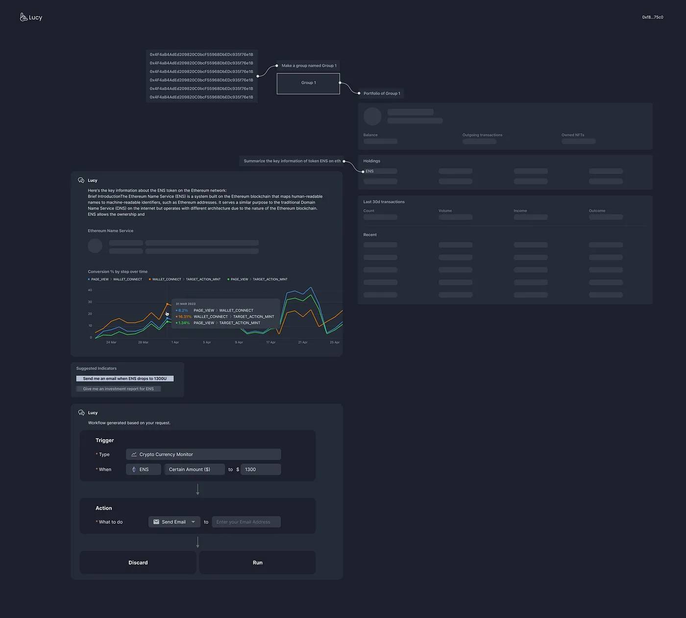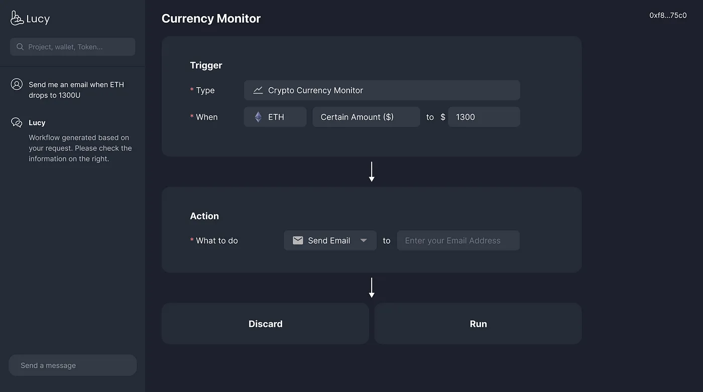 AI Chat 理解这些目标后,Lucy Beta 的算法会规划并搜索相关工作流程,列出实现这些目标所需的步骤。除必要的钱包操作外,每一步都设计为可自动执行,最大限度地减少用户手动操作,使过程尽可能顺畅和高效。