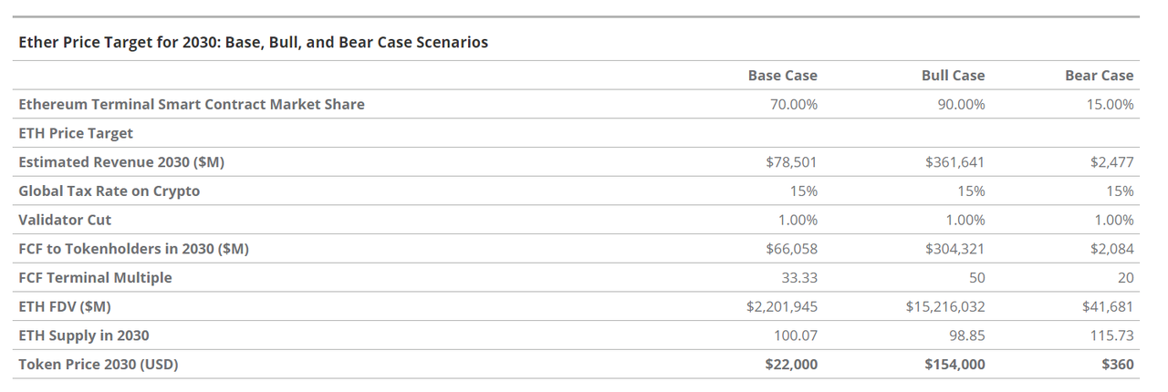 ETH 是以太坊的原生代币,是一种新型资产,它使投资者接触到高增长、互联网原生商业系统,该系统有可能破坏现有的金融业务和谷歌以及苹果等大型科技平台。以太坊在过去 12 个月中吸引了约 2000 万月活用户,同时结算了 4 万亿美元的价值并促成 5.5 万亿美元的稳定币转账。以太坊上拥有超过 912 亿美元的稳定币、67 亿美元的代币化链下资产和 3080 亿美元的数字资产。该金融系统的核心资产是 ETH 代币,在我们更新的基本面中,我们认为到 2030 年 ETH 将达到 2.2 万美元,比今天的 ETH 价格总回报率为 487%,复合年增长率 (CAGR) 为 37.8%。