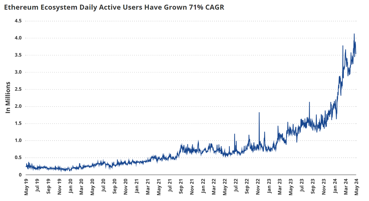 无论其分类如何,ETH 都受益于以太坊日益增长的使用。以太坊是一个充满活力的经济平台,可以被视为一个数字商城,其用户量增长了 1500%,自 2019 年以来收入以 161% 的复合年增长率飙升。在过去的一年里,以太坊产生了 34 亿美元的收入。由于必须购买 ETH 才能使用以太坊,因此所有 ETH 持有者都受益于需求驱动的货币流入。此外,这些 ETH 收入的 80% 用于回购和销毁流通的 ETH,以将其永久从流通中移除。这类似于不可逆转的股票回购。