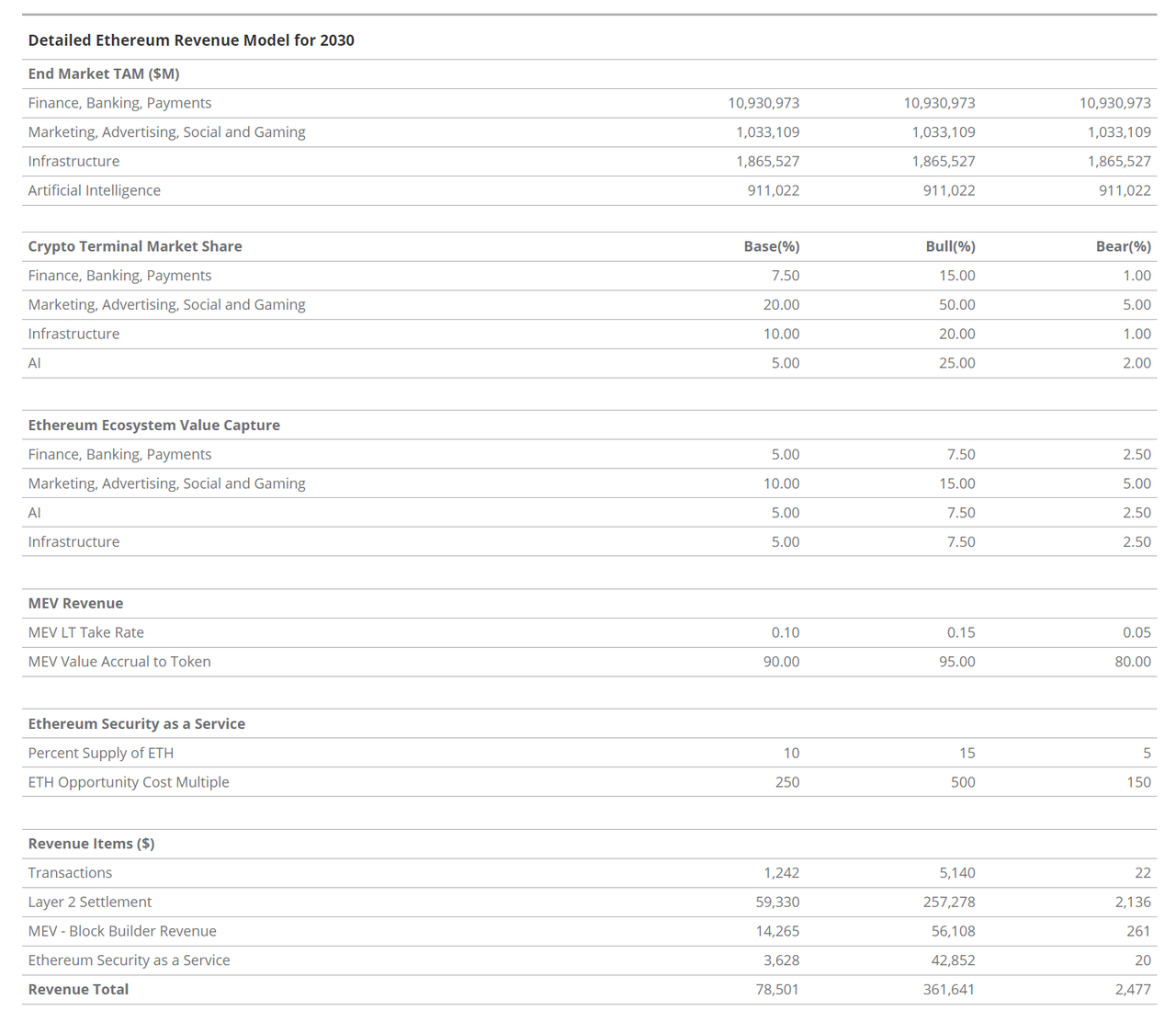 据 TAM 数据,我们利用以太坊等区块链对这些收入进行市场捕获估计。FBP、MASG、I 和 AI 的渗透率分别为 7.5%、20%、10% 和 5%。我们预测建立在以太坊而不是其他区块链上的加密应用程序的份额,我们的基本情况是 70%。我们估计以太坊将向应用程序用户收取的费用,这实际上是这些应用程序收入的「抽成率」,计算出是 5-10%。我们最近更新了 2023 年春季的 ETH 模型,增加了 AI 终端市场,以反映以太坊在该领域的巨大潜力。对之前模型的其他有影响力的调整是增加 ETH 供应的消耗、更大的终端市场捕获以及对基础经济活动的更高接受率。我们认为这些变化是合理的,因为基本面使以太坊更容易获得的最新创新以及美国不断变化的政治。