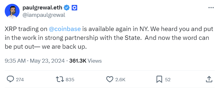 5 月 23 日,Coinbase 首席法务官保罗-格鲁瓦尔(Paul Grewal)宣布,纽约州的客户在中断 9 个月后,可以再次在该加密货币交易所交易 XRP。