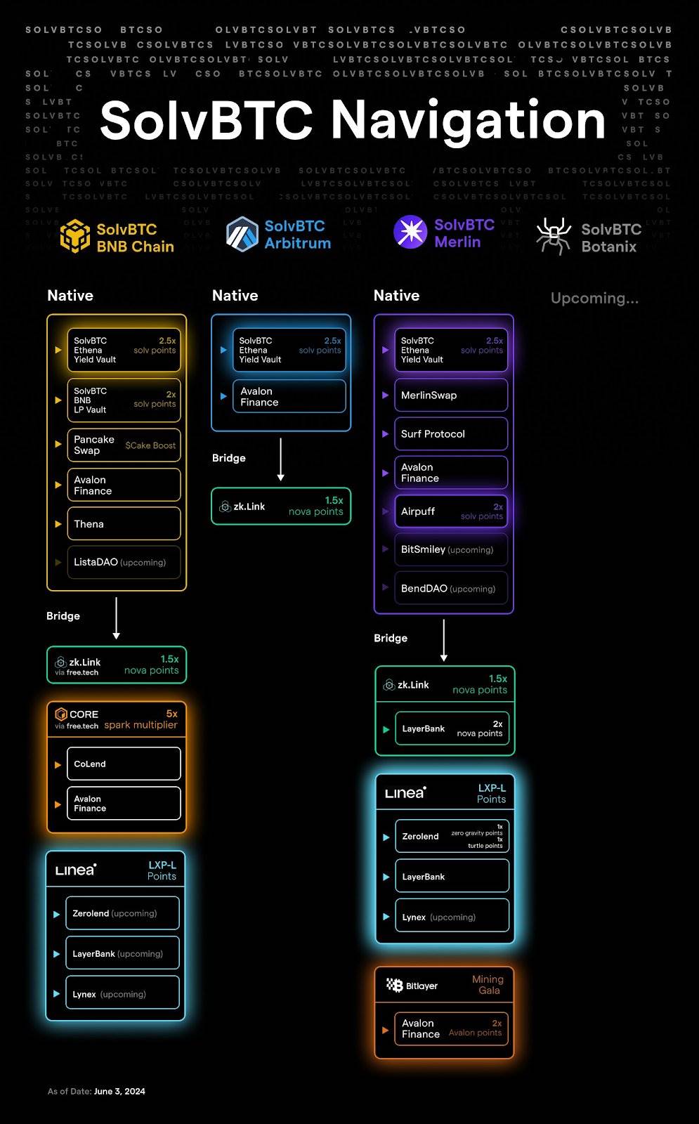 由于 SolvBTC 目前在三条源链(@BNBCHAIN 、 @arbitrum 和 @MerlinLayer2)上运行,我不仅尝试在这些源链上farm,还尝试在非源链和不同类型的积分上进行farm。