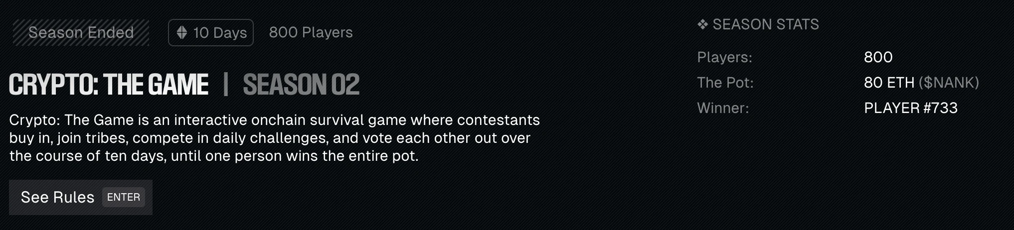 在过去的几个月内,CTG 已经成功举办了两季游戏。其中,第一季游戏共有 410 名玩家参与,奖池总金额为 41 ETH,最终一名叫作 MFL 的匿名玩家取得了胜利;第二季游戏共有 800 名玩家参与,奖池总金额为 80 ETH,最终第 733 号玩家取得了胜利。