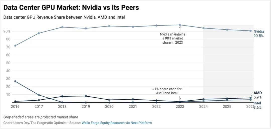 据估计,英伟达在过去 7 年间牢牢占据数据中心 GPU 市场 90% 以上的份额。2023 年,其份额更是达到 98%,所有大型数据中心的运转和大模型训练,都需要依赖于英伟达研制的 GPU。