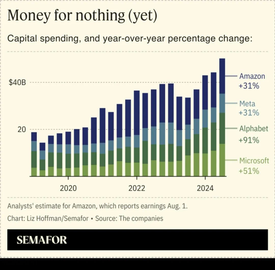 只需要查看一个数据就可以理解竞争对手们为何有如此决心:据最新季度财报,微软、谷歌和 Meta 的 2024 第二季度总资本支出超过 400 亿美元 — — 其中大部分花在了 AI 上。