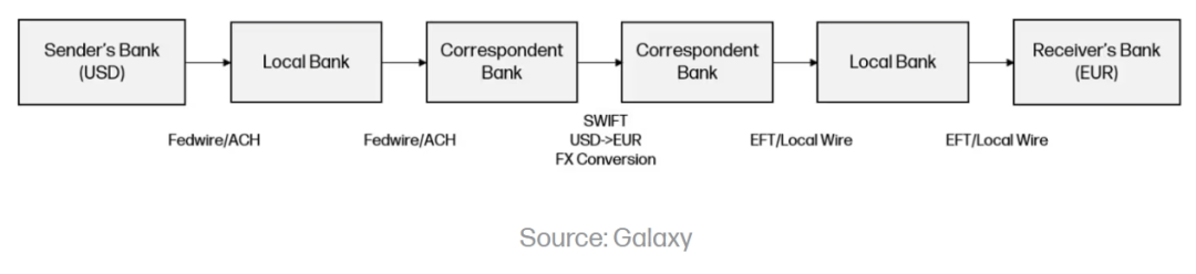 当前金融基础设施的一个显著问题是缺乏全球标准,且各国割裂分散的金融支付体系阻碍了无缝的国际间交易,并给建立一致的支付体系带来了复杂性。这种复杂性最能够通过跨境支付交易的结构来说明(如下面是一个从美国用美元汇款到欧洲欧元入账的一个案例),其中包含许多实际的多个痛点: