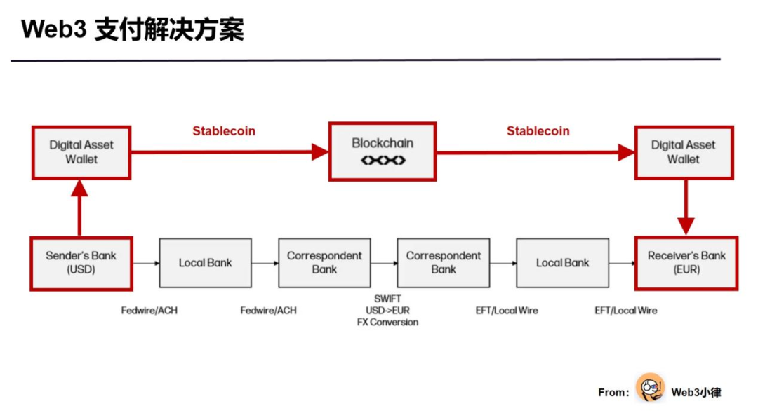 构建在区块链上的稳定币,作为代币化货币的一种主要形式,如今已经成为跨境支付等领域目前存在的挑战提供理想的解决方案。让我们回顾此前复杂的跨境支付示例,来看 Web3 支付的优雅解决方案(如红框所示):