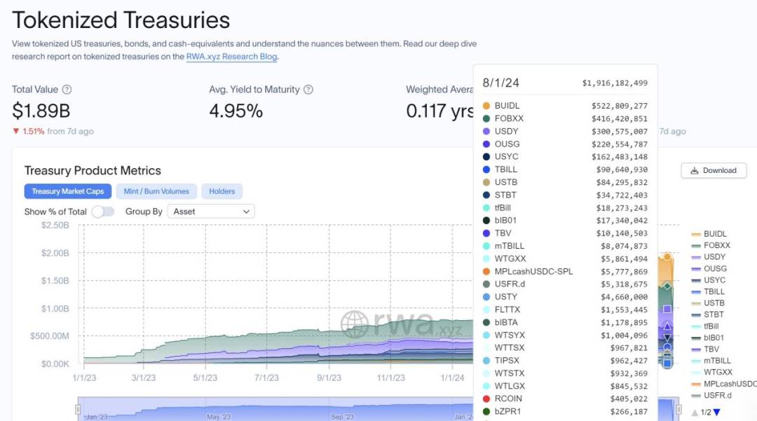 根据 RWA.XYZ 数据,代币化美债市场规模已经从 2024 年初的 7.7 亿美金上升到如今的 19.16 亿美元(截至 2024 年 8 月 1 日),上涨幅度达到 248%。