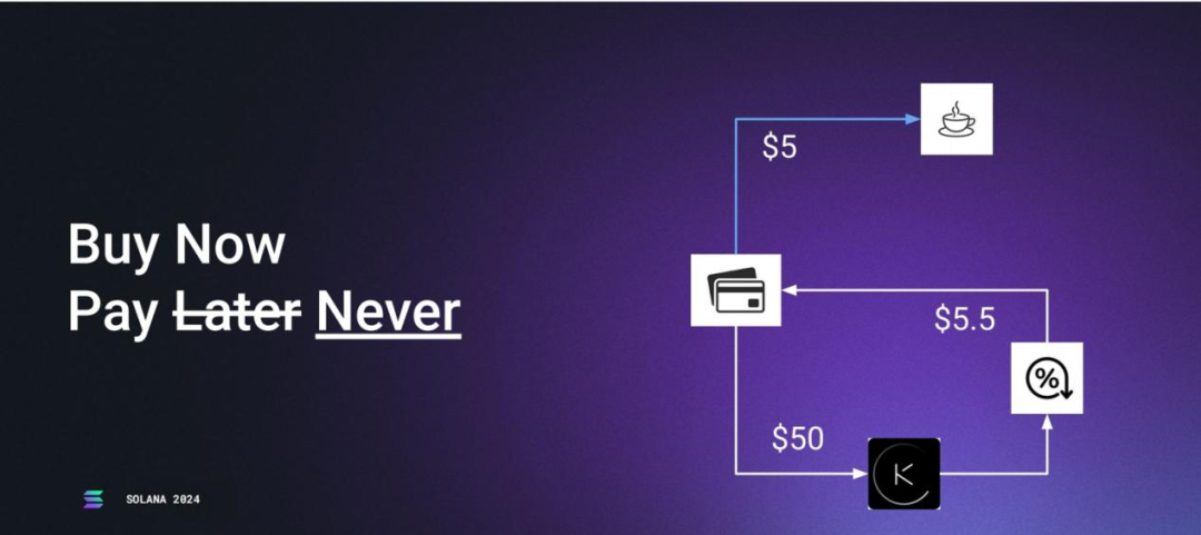 Lily Liu 在其分享中提到了先买后付(Buy Now Pay Later)的概念,可以由 PayFi 将其改造成买了不付(Buy Now Pay Never)。这里来做一下解析,想象一个用户 Kevin 花 5 美金买咖啡的场景,PayFi 支付服务商来收单。