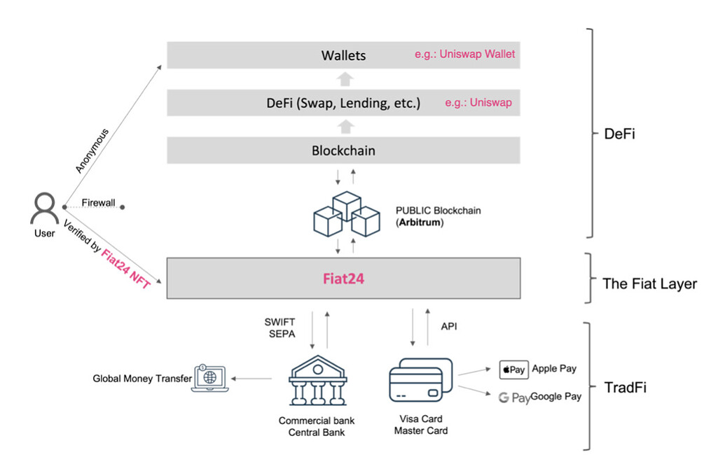 Fiat24 创新的区块链银行架构将能够将传统银行服务和 Web3 支付创新无缝融合,在增强便利性的同时也加强了安全性,避免了单点故障的风险。与任何其他传统银行不同,Fiat24 面向众多非托管钱包用户,可以将 Fiat24 想象成 DApps 的法币协议层(Additional Fiat Layer for DApps),例如架构在 Uniswap 之下的 Fiat Layer Banking Protocol。
