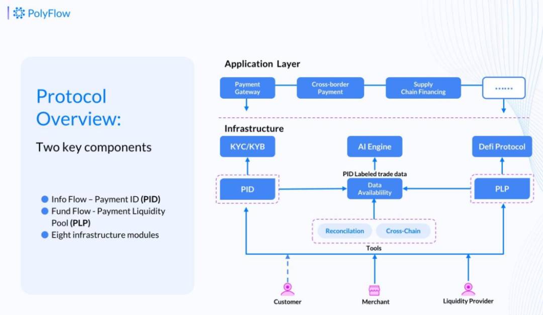 PolyFlow 通过模块化的设计,推出 Payment ID(PID)和 Payment Liquidity Pool(PLP)两个关键组件,能够将支付交易的信息流与资金流进行抽象分离,掘取其中价值。PID 与信息流关联,作为实现身份识别、合规准入、数据主权、AI 数据分析的强大工具,PLP 则与资金流关联,由智能合约管理用于支付的资金,从而整体实现了一个监管合规、无托管风险的加密支付网络。