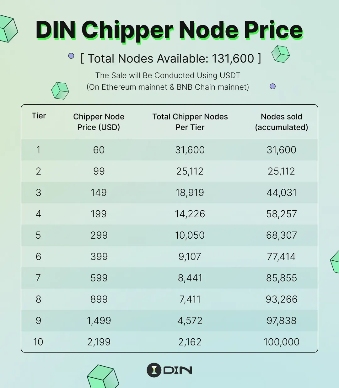 DIN的节点销售分为三个阶段:预售轮、白名单销售轮和公开销售轮。每个阶段的销售价格和条件有所不同,以吸引不同类型的投资者。预售轮主要面向早期产品用户和社区核心贡献者;白名单销售轮面向特定机构、社区和KOL合作伙伴;公开销售轮则面向广大公众投资者开放。