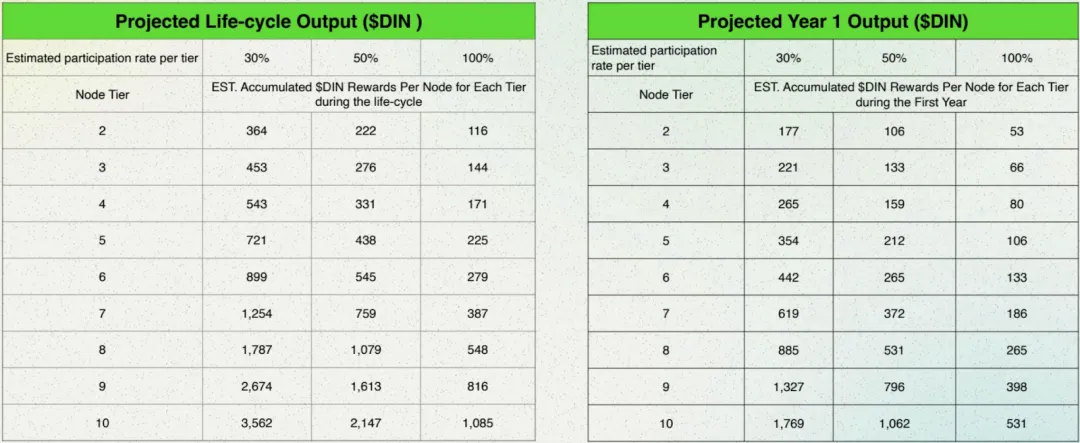 公开销售轮分为两个阶段,第一阶段(Tier 3 - 5)和第二阶段(Tier 6 - 10)。Tier 3的节点价格为149美元,第一年获得的节点奖励为133 $DIN,对应价值为1995,购买者将在36天回本。Tier 6的价格为300美元,第一年获得的节点奖励为265 $DIN,对应价值为3975,且购买者仍将在3个月内回本。