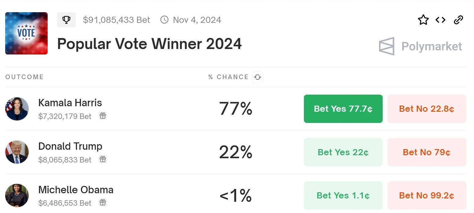 预测市场 Polymarket 数据显示,Kamala Harris(下称哈里斯)赢得 2024 年美国总统普选的概率已升至 77% ,而特朗普则下降至 21% 。一个月前因遇刺事件,特朗普的当选概率一度上升至 70% ,远超拜登,连带着比特币迎来一波大幅上涨,最高触及 7 万美元高点。