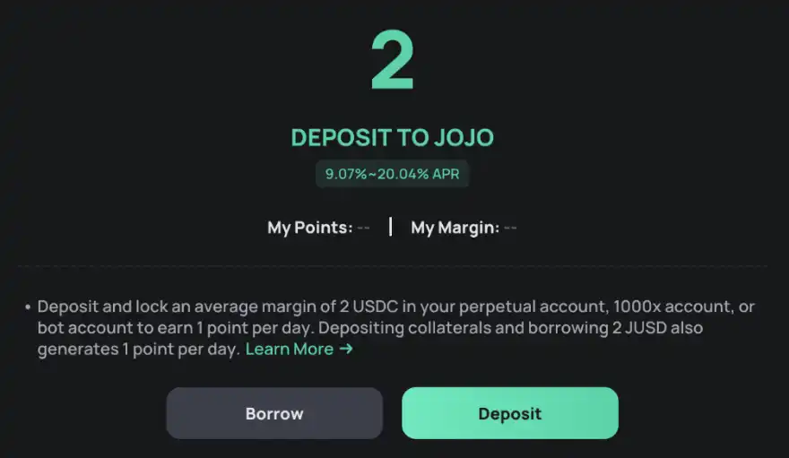 · 向流动性池每添加等值 1 美元的 JOJO-ETH LP 代币,每天可获得 1 个 JOJO 积分。