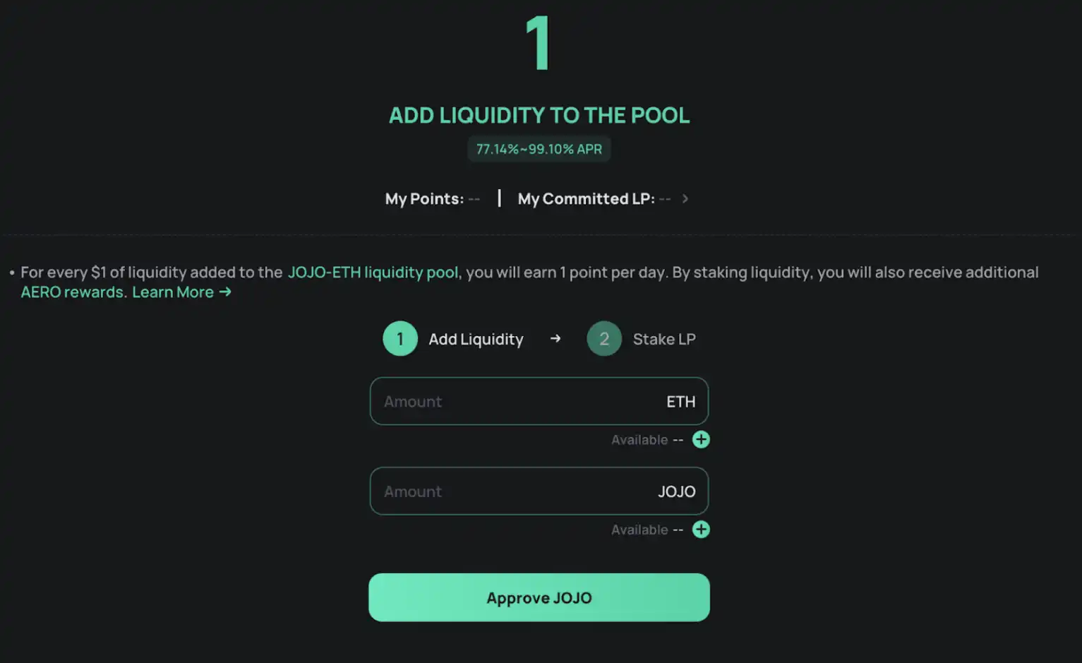 · 向 JOJO-ETH 流动性池添加流动性并抵押 JOJO-ETH LP 代币。